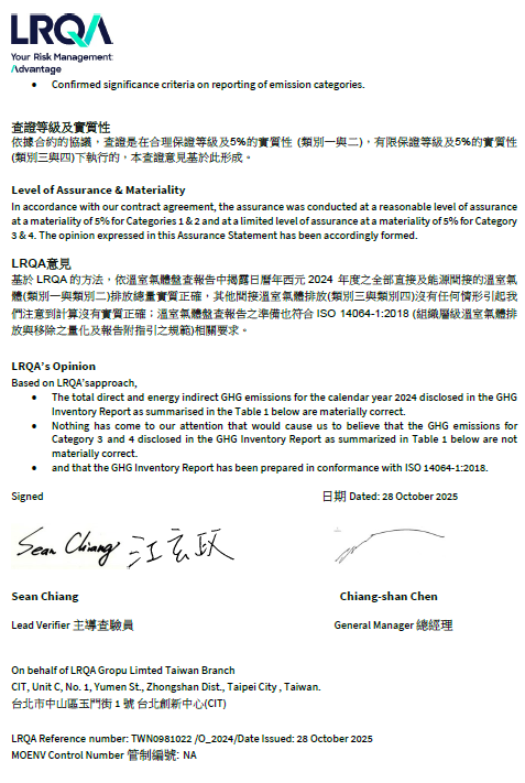 - 對供應商、承攬商、承運商傳達環安衛政策,共同保護環境、提升安全健康而努力。